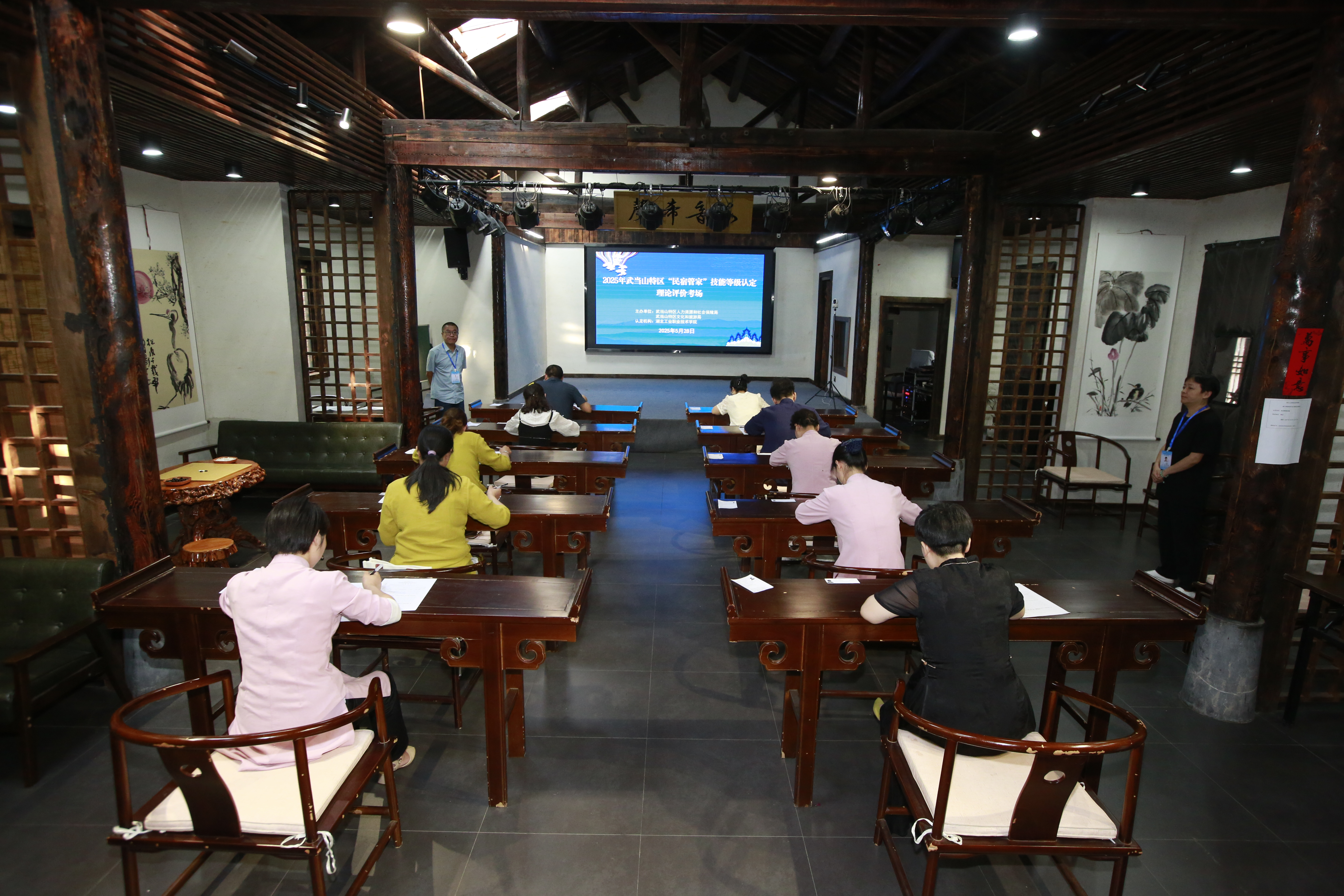 5月28日,湖北省首次“民宿管家”职业技能等级评价考试在武当山特区成功举办。本次认定考试为四级(中级),来自特区9家精品民宿的11名资深从业人员参加考核,标志着武当山民宿产业迈入标准化、专业化发展新阶段。