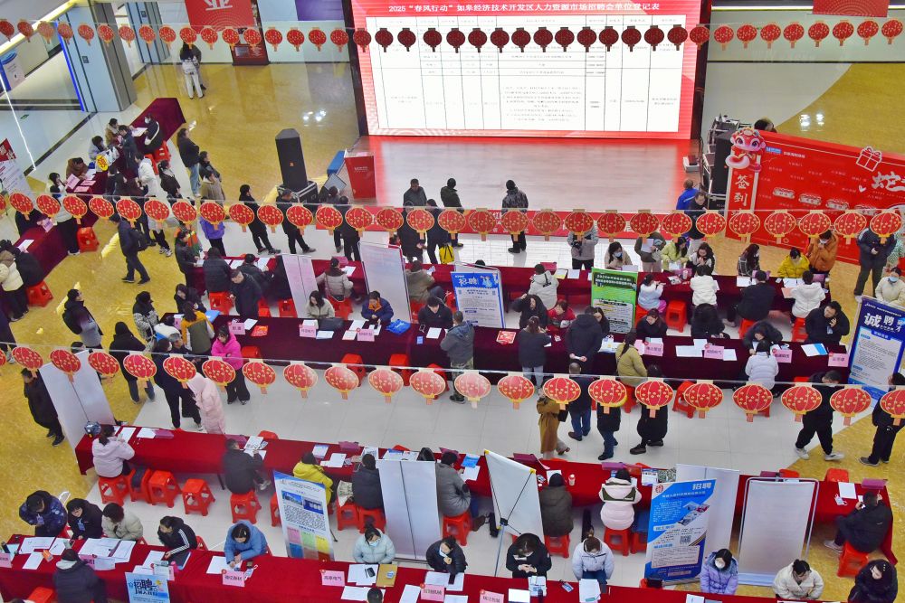 ↑1月22日,求职者参加江苏省如皋市2025“春风行动”招聘会。新华社发(吴树建摄)