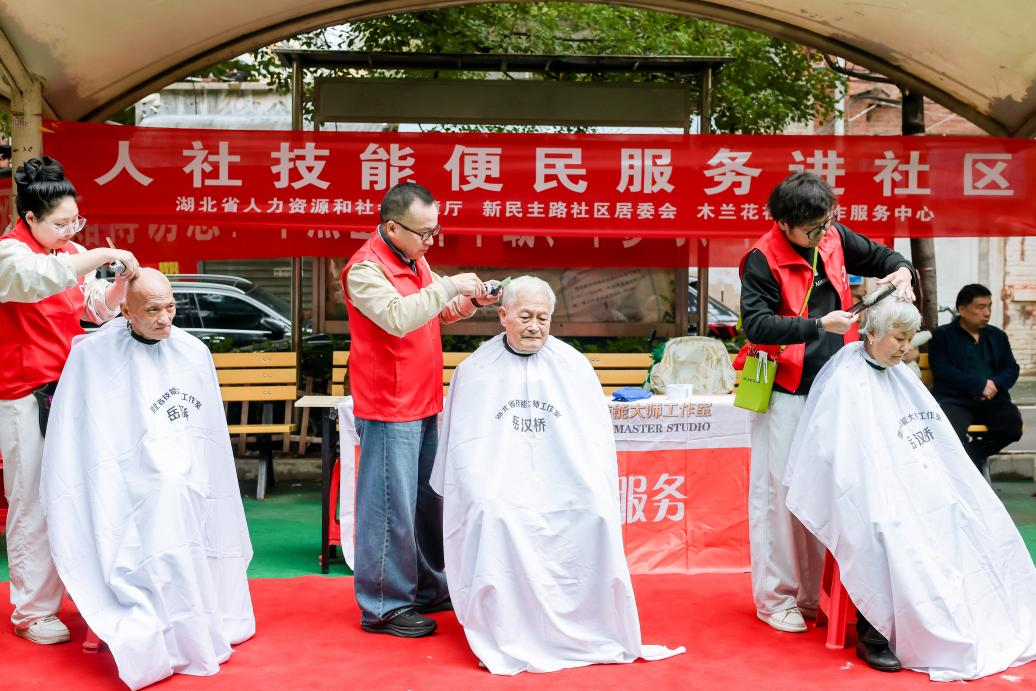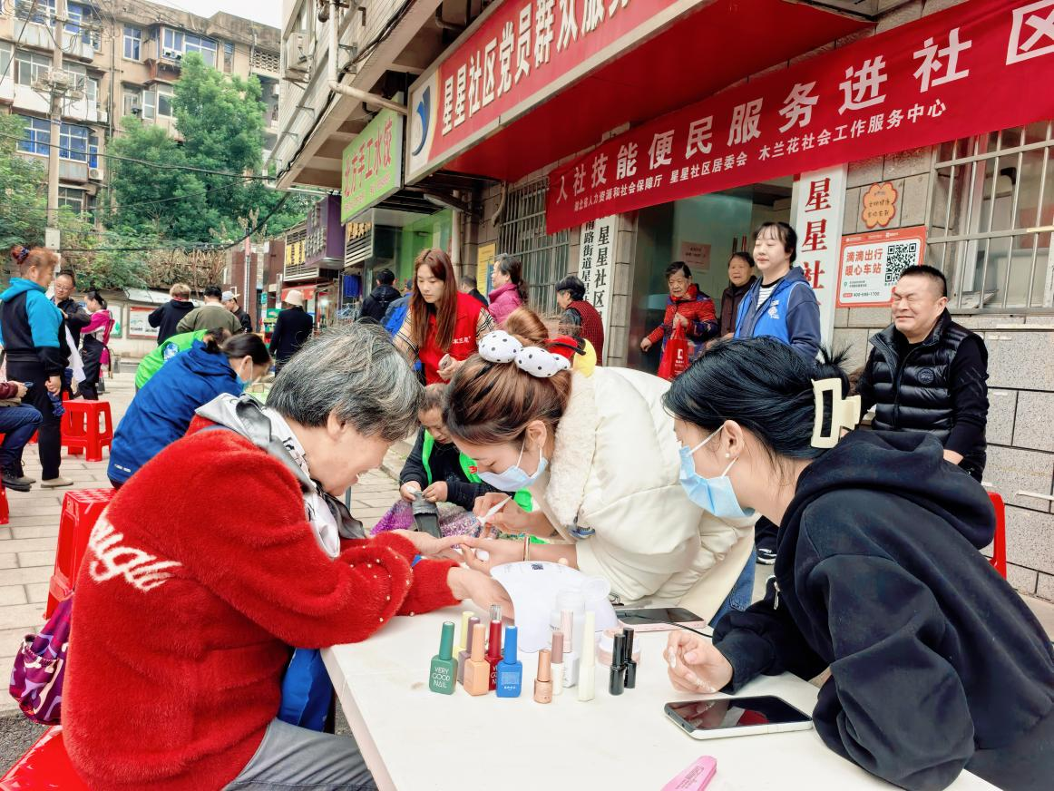 活动紧扣老年人实际需求,开设特色便民服务专区。现场特邀国家级、省级美发技能大师为社区居民提供专业免费的理发服务。剪刀翻飞间,是手艺的展示,更是温暖的传递,许多老人理完发看着清爽满意的发型连声道谢。同时,来自蕲春的艾灸师为居民们带来专业的艾灸体验,帮助老人缓解疲劳、舒筋活络,让大家切身感受传统中医技艺的独特魅力。此外,手机贴膜、修鞋、修伞、美甲等贴心服务也一应俱全,深受老人们的欢迎。