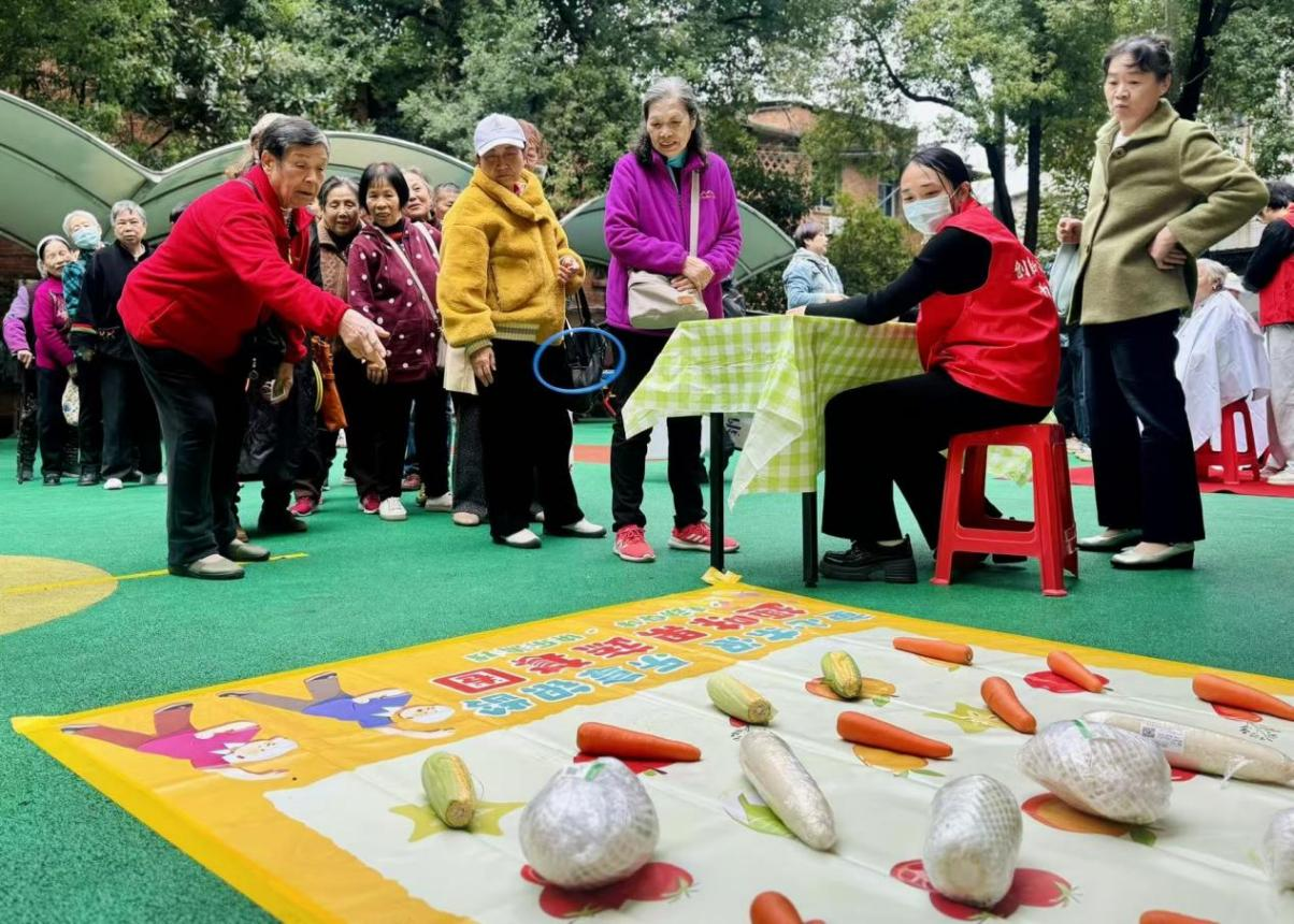 为丰富老人们的精神文化生活,现场还设置了适老趣味游戏。“蔬菜套圈圈”用新鲜蔬菜作为奖品,既有趣又实用,摊位前排起长龙;“趣味保龄球”活动让老人们在安全范围内活动筋骨,欢呼声接连不断。在欢声笑语中,老人们感受到节日的快乐与陪伴的温暖。