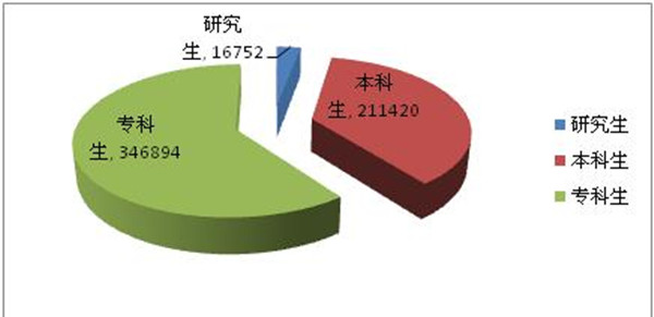 求职者简历中(含一简多投情况),研究生比例为3.6%,本科生比例为39.7%,专科生比例为56.7%,如下图。