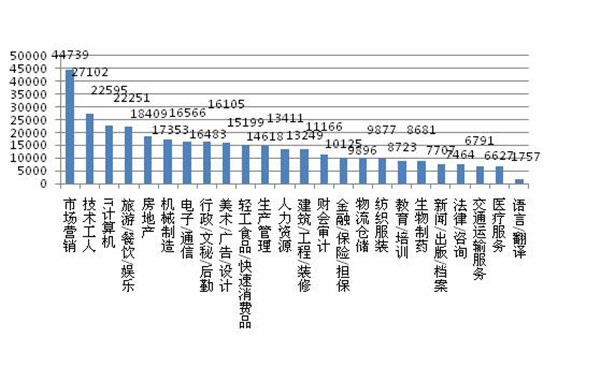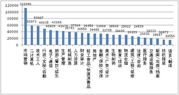 综合现场招聘和网络招聘的情况,用人需求量排名前五位的职位类别是市场营销、IT计算机、技术工人、机械制造和行政/文秘/后勤,情况如下表。