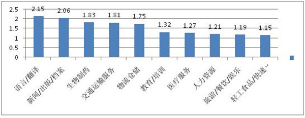 综合现场招聘和网络招聘,将用人单位人员需求量与求职者数量进行横向对比,分析显示,求职者过剩指数(计算公式见注2,表明求职者简历数相对招聘岗位数有过剩)中,求职者过剩率最高的职位是语言/翻译类岗位,排名情况如图表9。