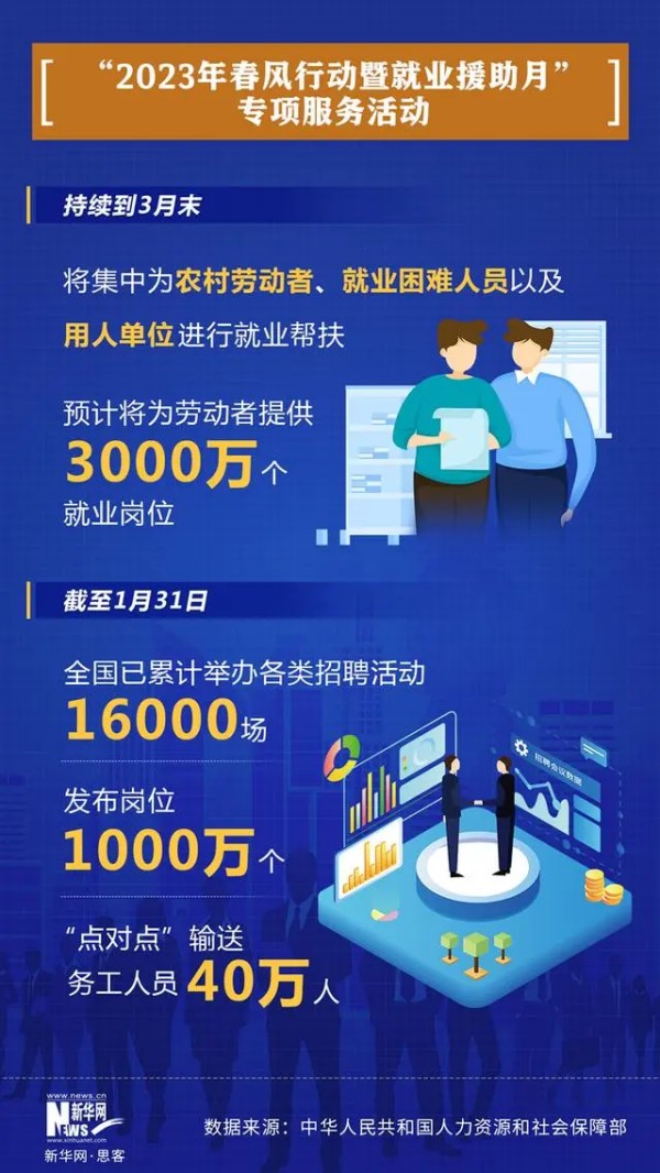 为进一步促进就业、保障用工,猫都论坛部等11个部门启动“2023年春风行动暨就业援助月”专项服务活动,帮助有就业创业意愿的农村劳动者、符合认定条件的就业困难人员以及有用工需求的用人单位,通过全面组织就业摸排,精准开展对接服务,提供就业服务、技能培训、权益维护全方位服务。